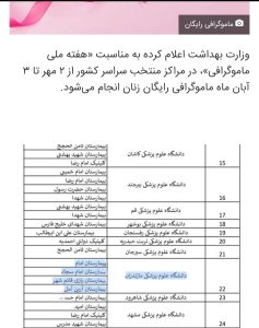 مرضیه لشکری، رئیس اداره سرطانِ معاونت درمانِ وزارت بهداشت، درمان و آموزش پزشکی، به تازگی در گفتوگو با رسانهها از آغاز اجرای طرح ملی «هفتهی ماموگرافی رایگان زنان» خبر داده است؛ طرحی که از ۲۶ مهر تا ۳ آبانماه ۱۴۰۴ با هدف پیشگیری و تشخیص زودهنگام سرطان پستان، در مراکز منتخب سراسر کشور اجرا میشود.
